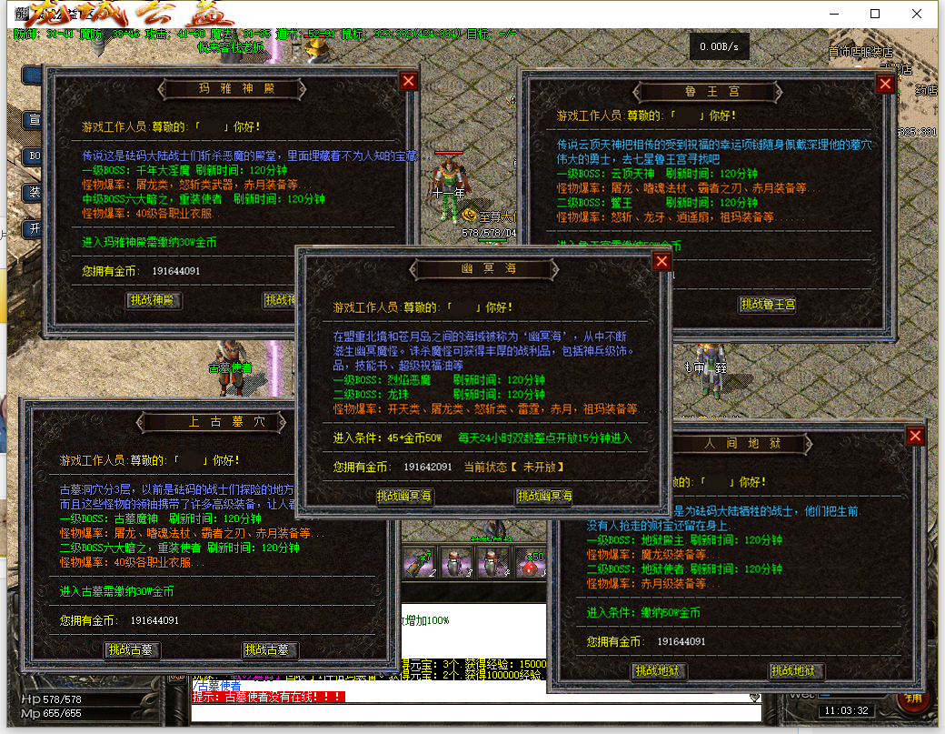 - 修罗祭坛,不归路,离恨天等等请游戏内体验,超级BOSS,难度高,爆率高