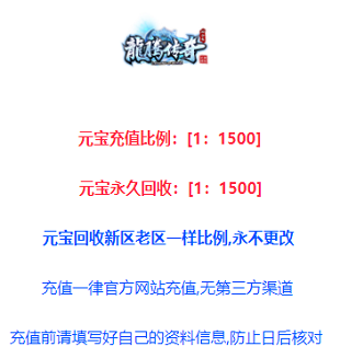 ①【元宝比例】:官方平台网银充值1:1500元宝,官方永久回收1:1500元宝!