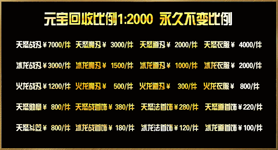 【回收介绍】:装备回收单件最高7000RMB!官方回收1:2000元宝,永久不变!
