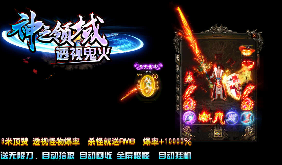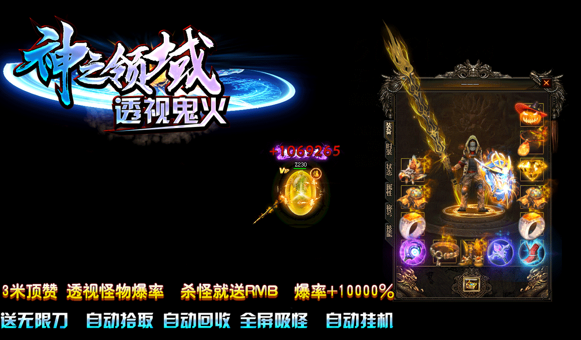 9.游戏特色: 全屏吸怪 自动挂机 透视怪物爆率 杀怪就送RMB 爆率+10000%