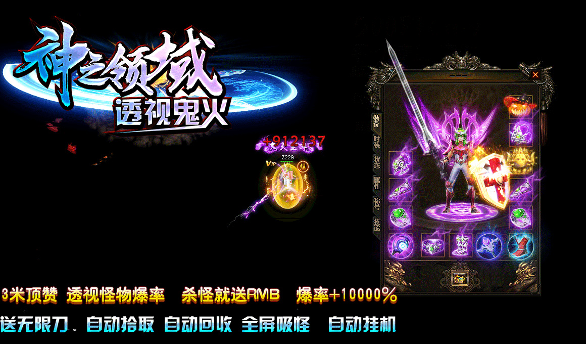 2.游戏特色: 全屏吸怪 自动挂机 透视怪物爆率 杀怪就送RMB 爆率+10000%