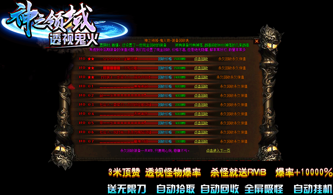 3.游戏特色: 全屏吸怪 自动挂机 透视怪物爆率 杀怪就送RMB 爆率+10000%