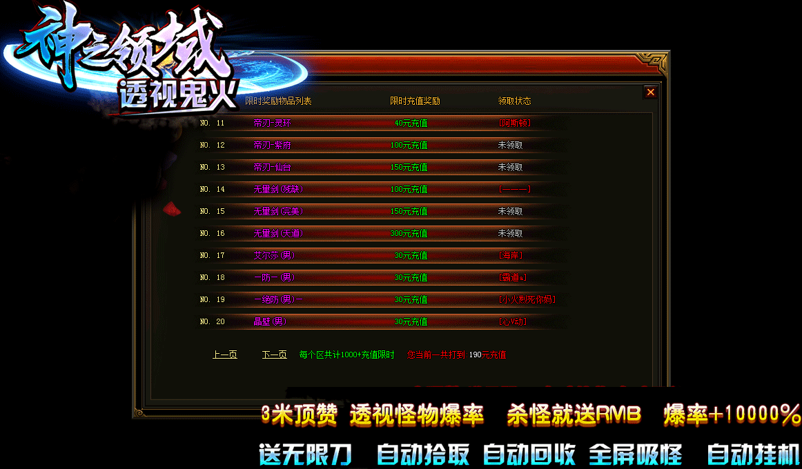 10.游戏特色: 全屏吸怪 自动挂机 透视怪物爆率 杀怪就送RMB 爆率+10000%