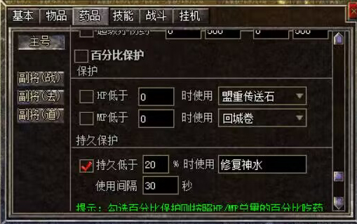 【自动喝药】:为杜绝外挂顶药,特设置脚本自动喝药,左侧按钮【使用中】即可设置80,免费使用药水!