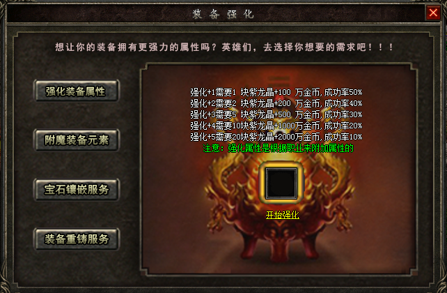 优化自身装备属性,也是本服特色玩法之一,每件装备可以提供三种优化方式,具体请在土城锻造炉NPC查看