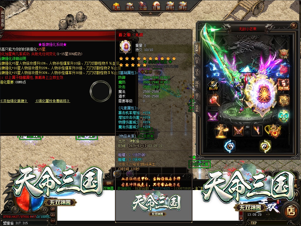 【更新介绍】:增加盾牌强化系统,最高可强化至15星,每强化5星额外赋予人物超强属性!