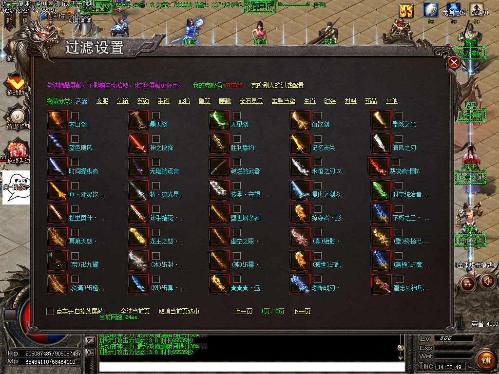 注:选择过滤后为玩家杀死怪物后此装备和道具不会爆出!