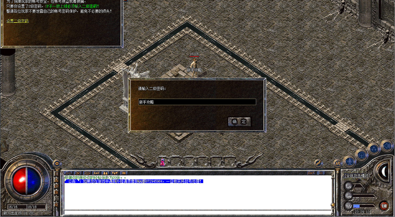现在简单介绍一下,新手玩家如何快速起步,进入游戏,点击二级密码,为了保证账号安全,建议二级密码设置为中文